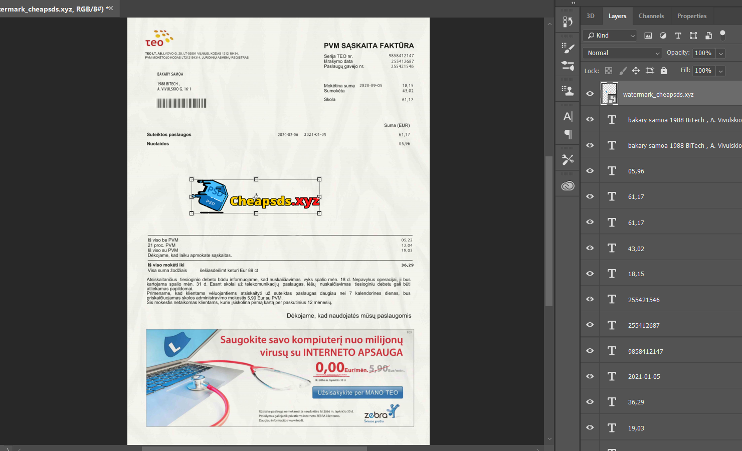 Grab now fully editable Lithuania Facture Teo Bill Psd Template from our website Cheapsds and put your own info to create a fake copy of Fake Lithuania Facture Teo Bill Template