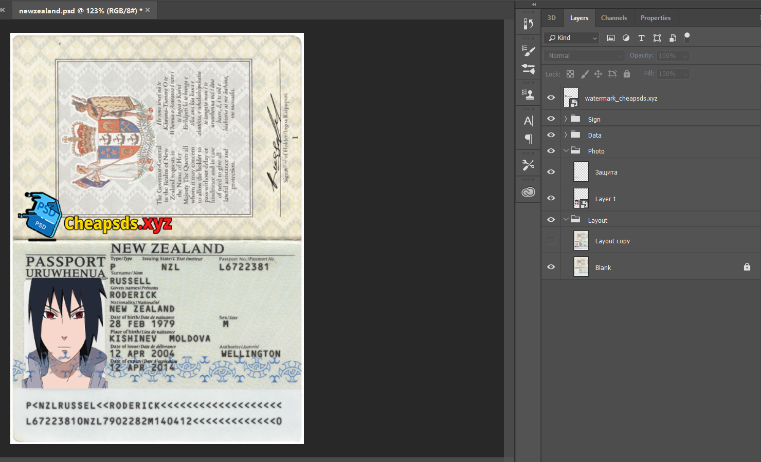 New Zealand Passport psd template Fully editable photoshop template. High quality template. Easy to customize, Layer based, fonts included.